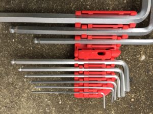 普通の六角レンチでは角度的にけっこうキツイので、こういったボールポイント付きの六角レンチが便利ですよ。