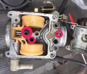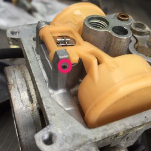 パイロットエアースクリューを組み直す時には、いったん固くなるまで締めてからその分戻したところがあなたのキャブレターのパイロットエアースクリューのもとの位置になります。(僕の場合はいっぱいに締めてから1-3/4回転戻したところです)